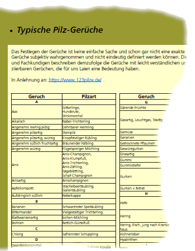Ich zeige auf 2 Seiten eine tabellarische Darstellung von typischen Gerüchen und den dazugehörenden Pilzarten.