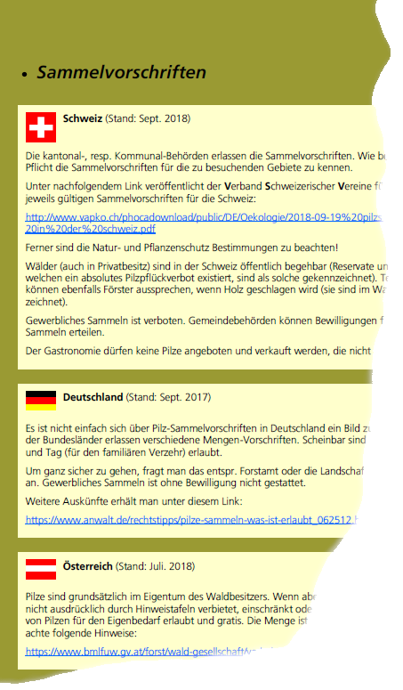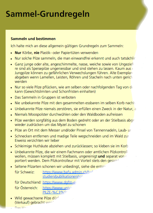 Als Sammler gilt es die lokal geltenden Gesetze und Vorschriften für das Sammeln von Pilzen zu kennen und zu respektieren.