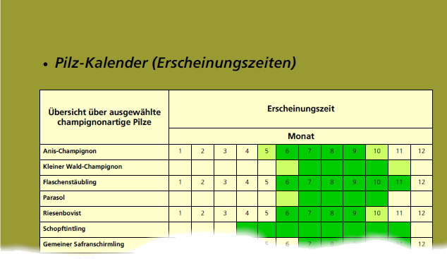Das Wissen über ideale Standorte der Pilze allein genügt nicht. Man sollte zur richtigen Zeit am richtigen Ort sein um die Chancen zu erhöhen die gewünschten Pilzarten anzutreffen. Praktisch alle Pilzbücher geben Auskunft über die Erscheinungszeit der beschriebenen Pilzarten, jedoch sehr selten findet man eine tabellarische Zusammenfassung.